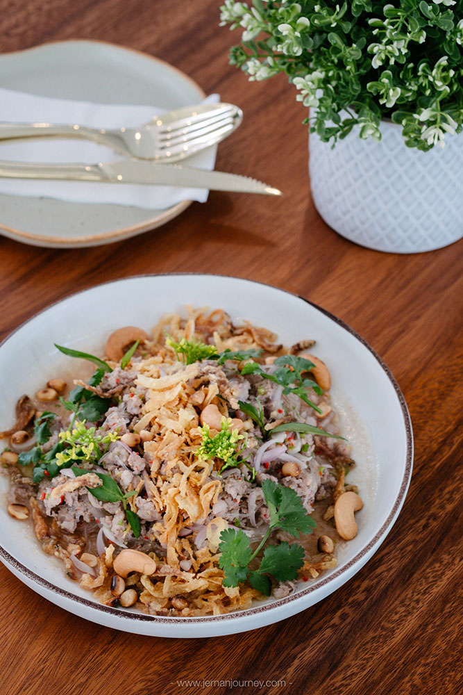 สำหรับร้านนี้ อาหารจะเน้นเป็นอาหารไทยฟิวชั่น รสชาติกลมกล่อมแบบไทยๆ เสิร์ฟมาแบบเต็มอิ่ม จานใหญ่ๆ จัดจานสวยงามไม่แพ้บรรยากาศร้านเลย