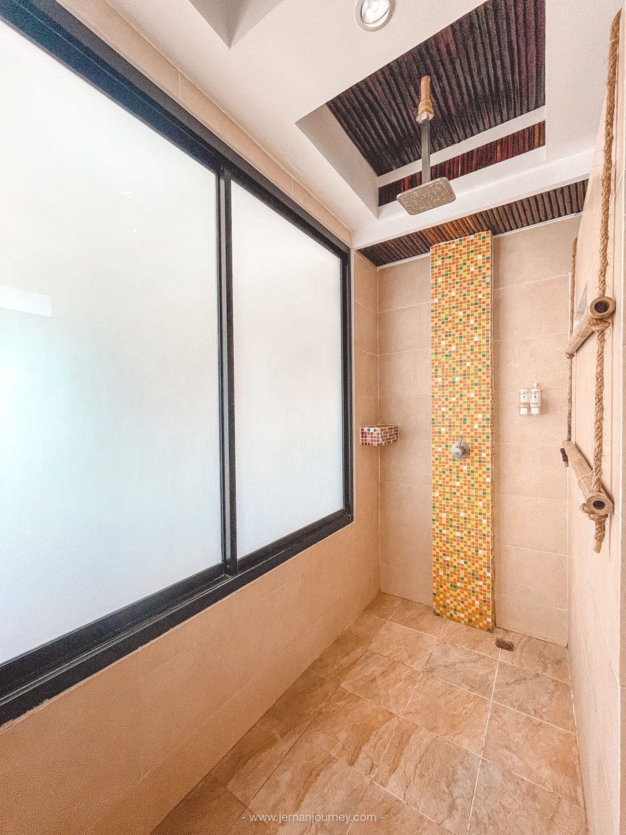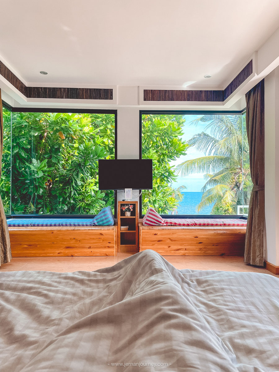 The room that we stayed in was called Deluxe Sea View. They use glass walls and sliding glass doors, so as its name, you can definitely enjoy the 180-degree ocean view from your comfy bed. There is also a corner where you can sit, relax, and read some good books.