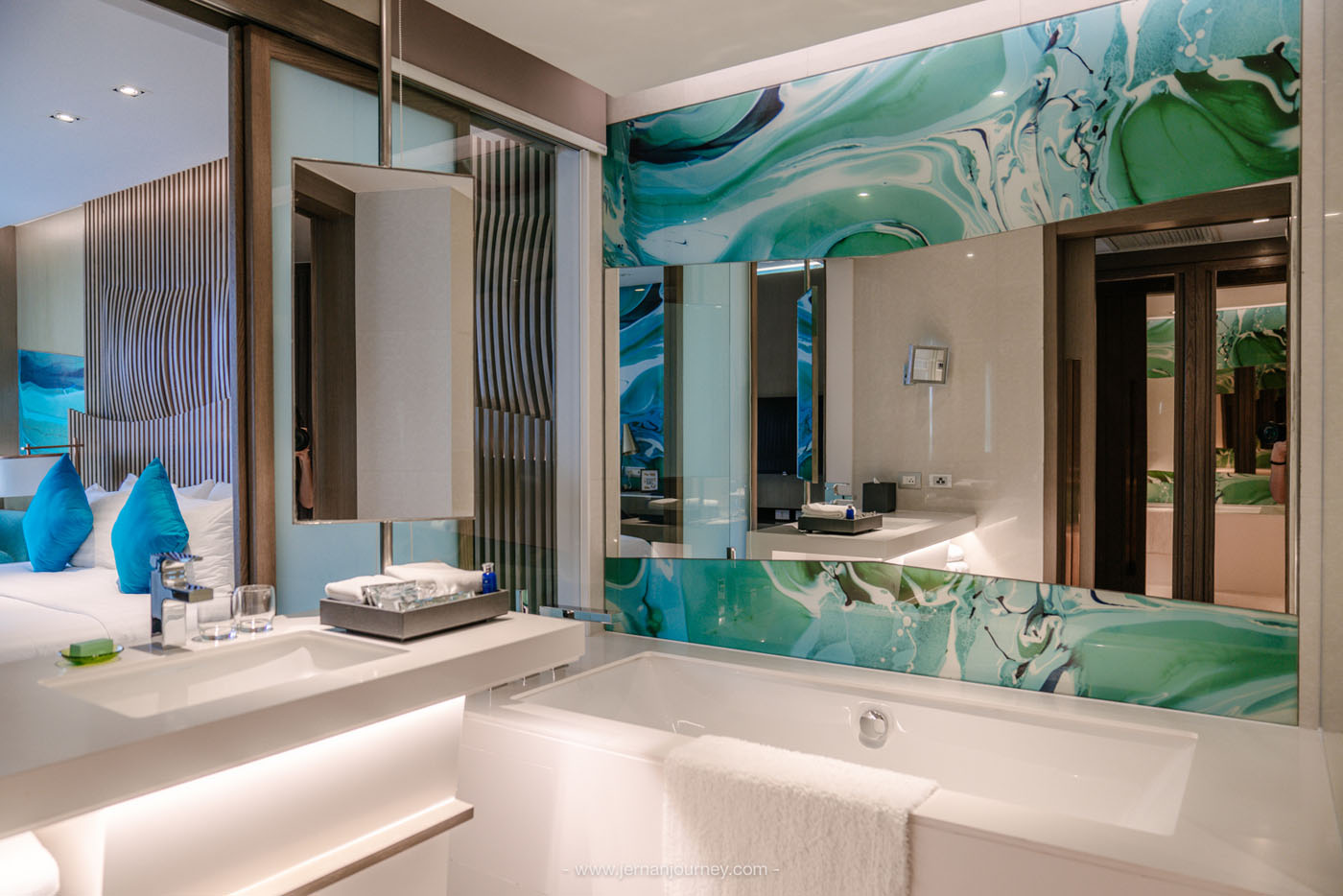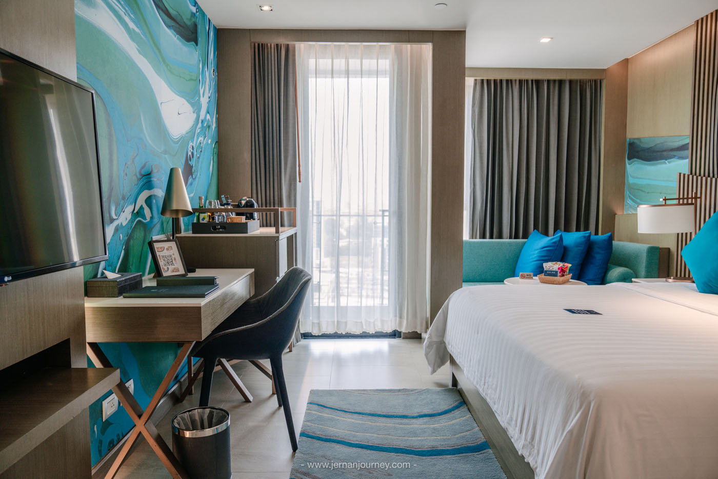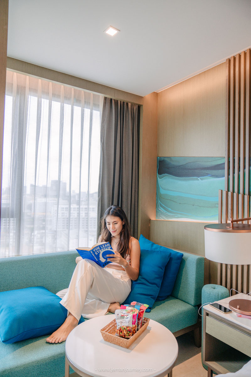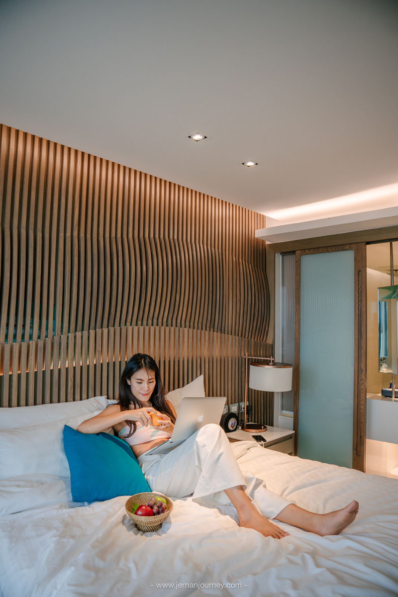 ที่นี่มีห้องพักเยอะมากและมีหลายแบบ ไม่ว่าจะเป็น Deluxe Urban, Deluxe Executive, Premier Lux, Urban Junior, Ocean Junior และ Marina Suite เราเข้าพักห้อง Premier Lux อยู่ชั้น 16 ทำให้มีความเป็นส่วนตัว ไม่อึดอัด และเปิดระเบียงออกไป ไม่ชนกับใครแน่นอน แถมยังได้เห็นวิวทะเลเบา ๆ ด้วย ภายในห้องตกแต่งได้ได้เรียบหรู โมเดิร์น แต่ก็มีความน่ารัก สบาย ๆ โดยการใช้โทนสีฟ้าขาว เตียงนอน ผ้าห่มและหมอนนุ่มมาก