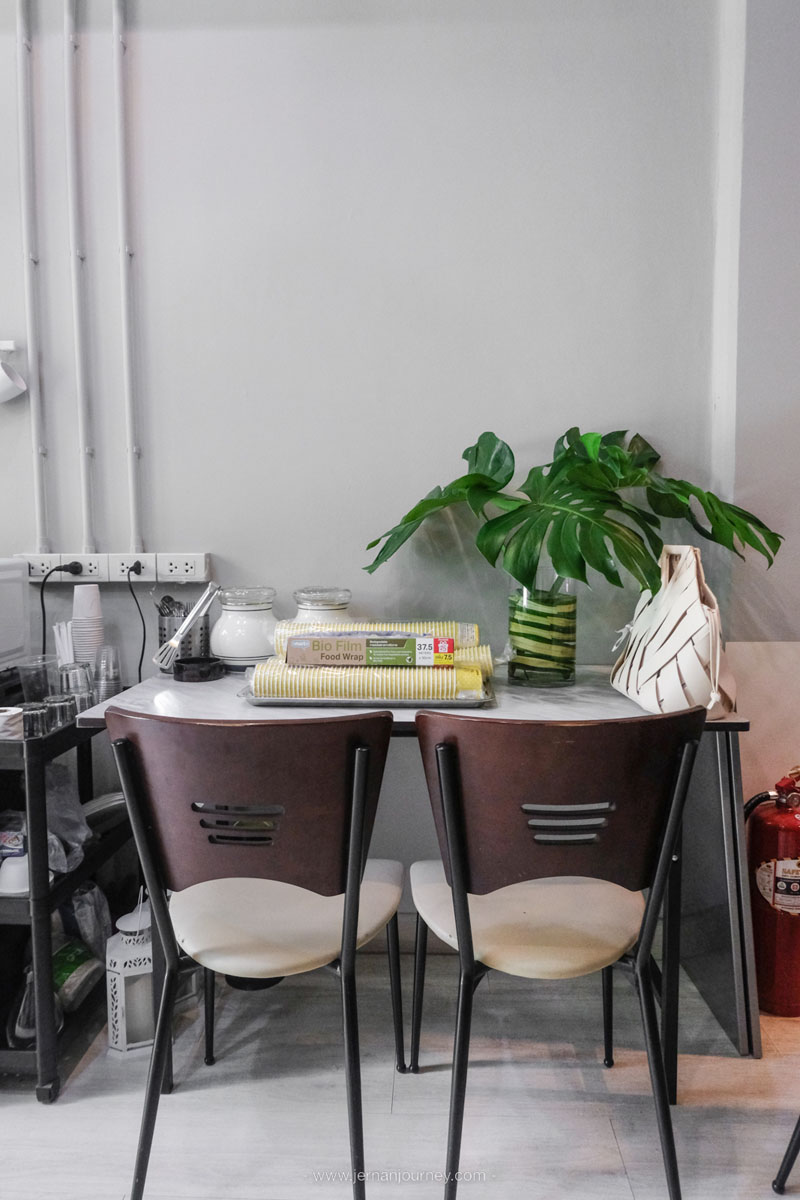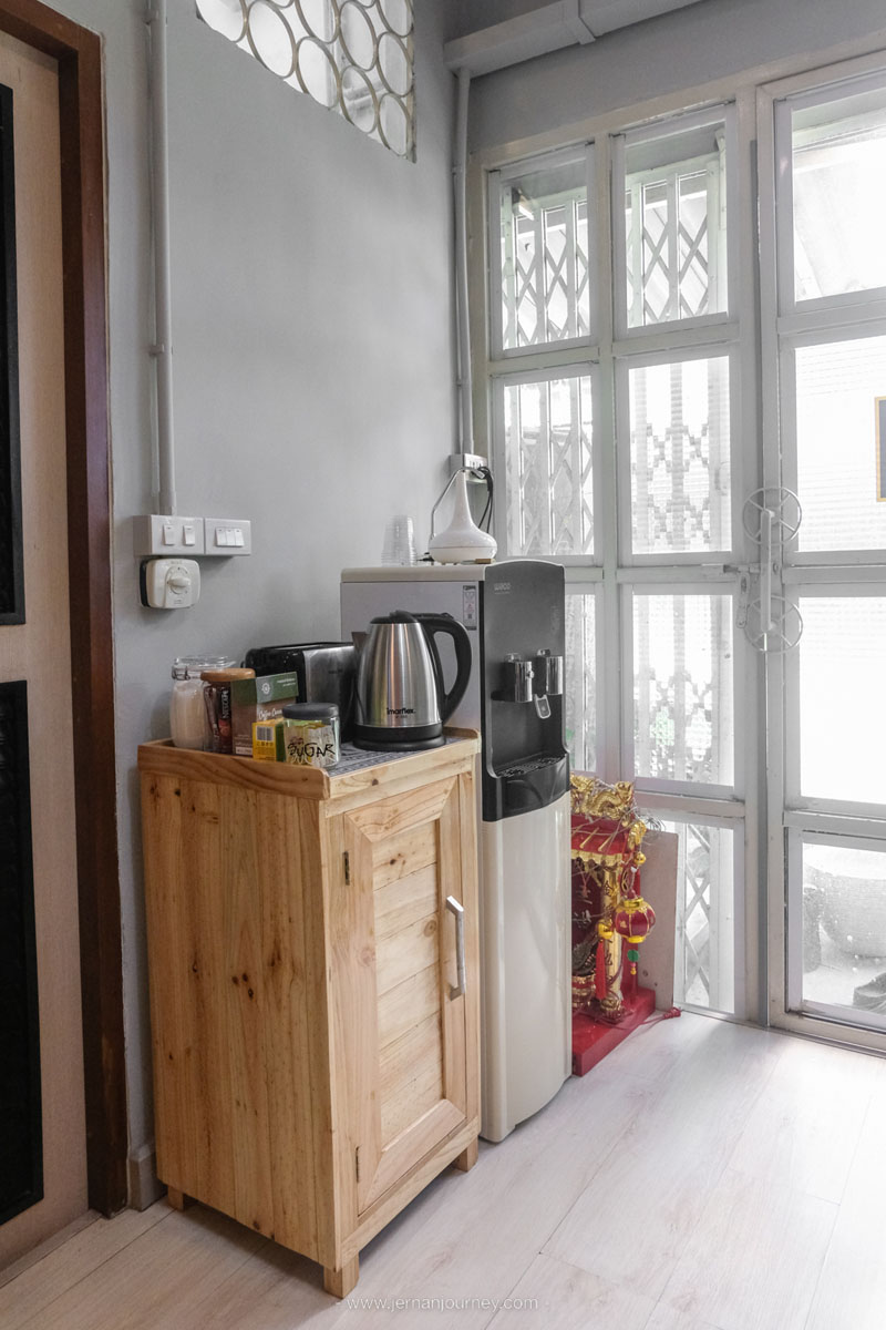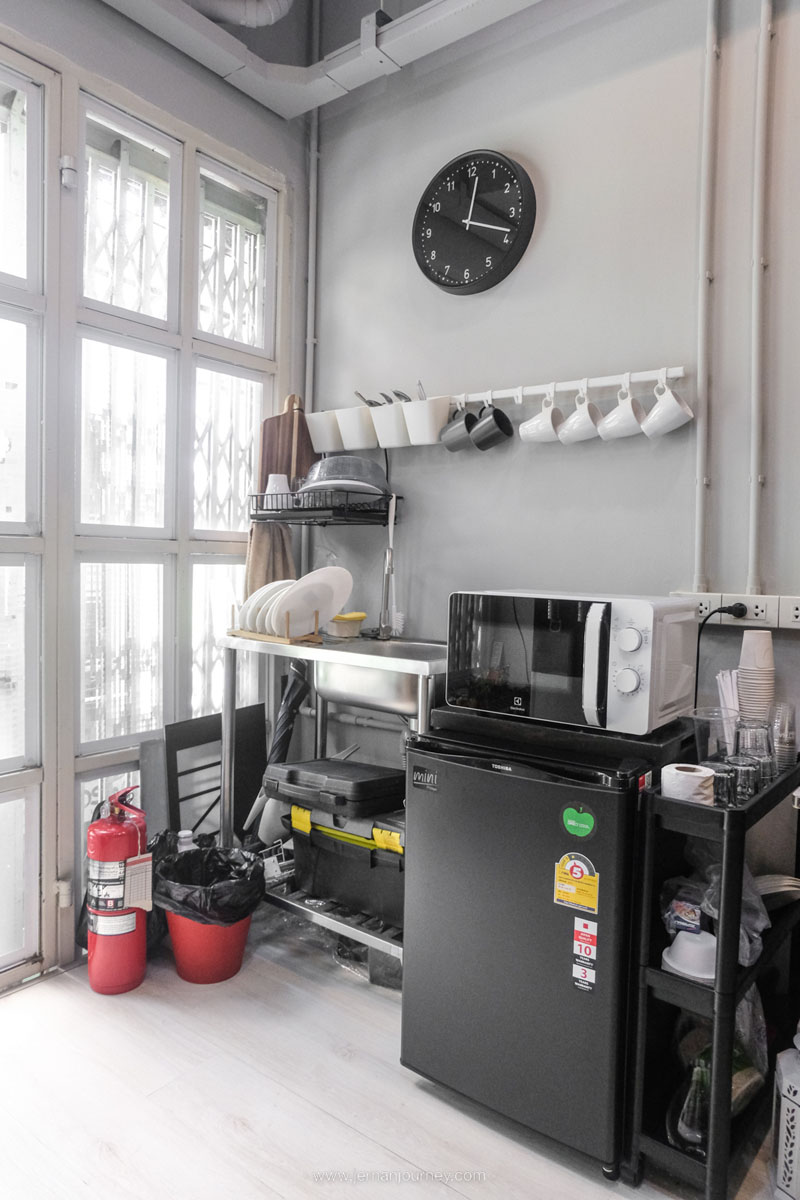 มีครัวเล็กๆ ให้ โดยมีแชร์ตู้เย็น ไมโครเวฟ เครื่องครัว และอาหารเช้าแบบกรุบกริบ ขนมปัง ชา กาแฟ ไว้ให้บริการ