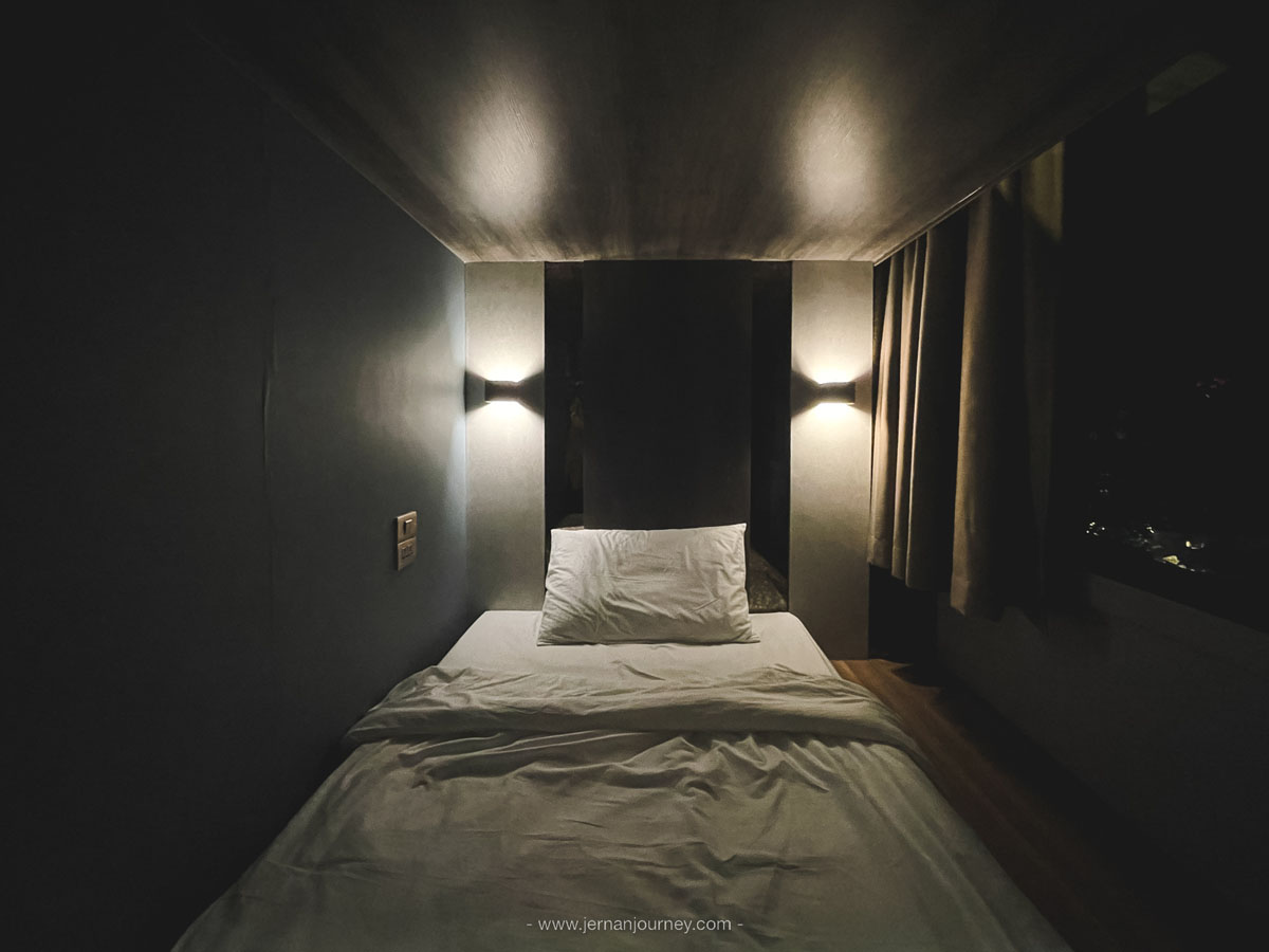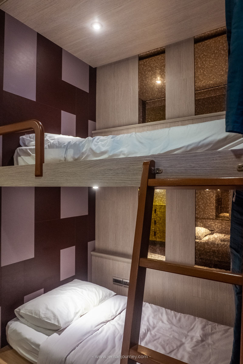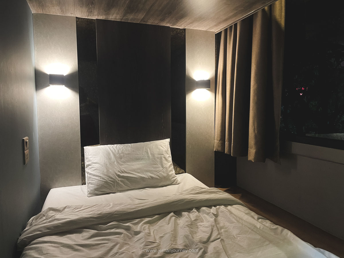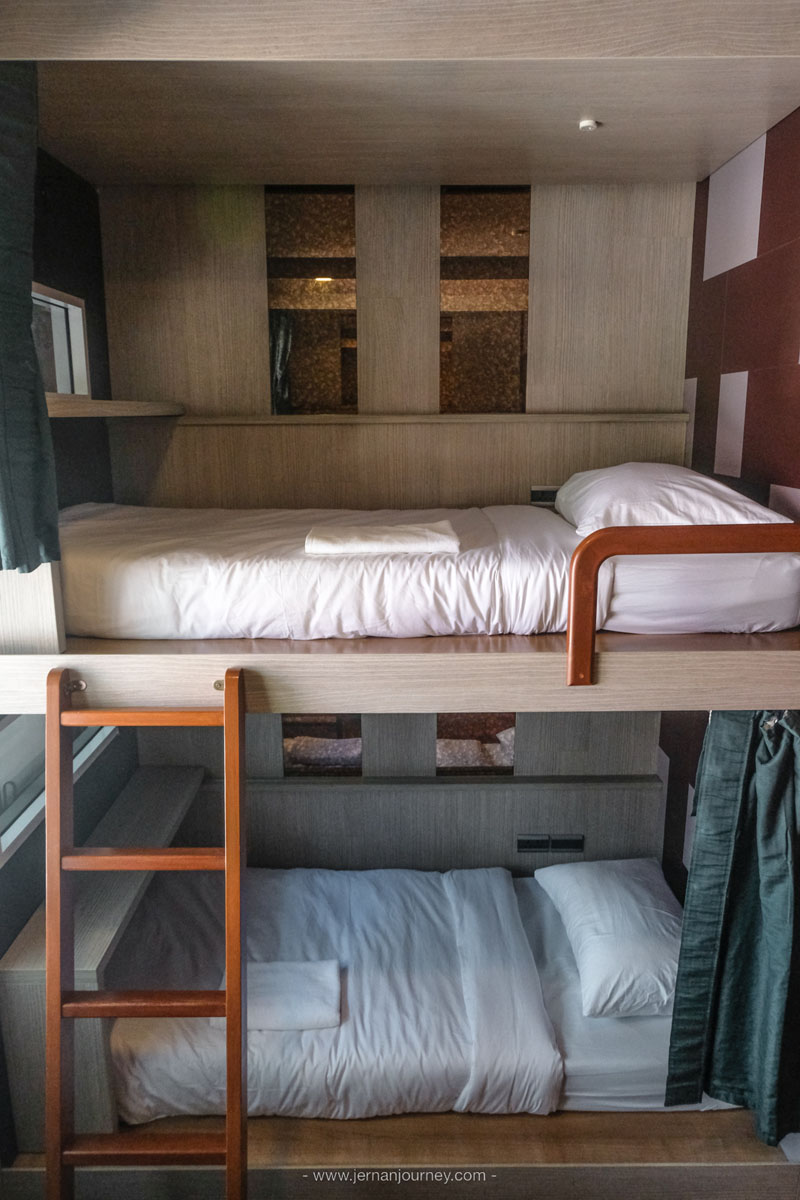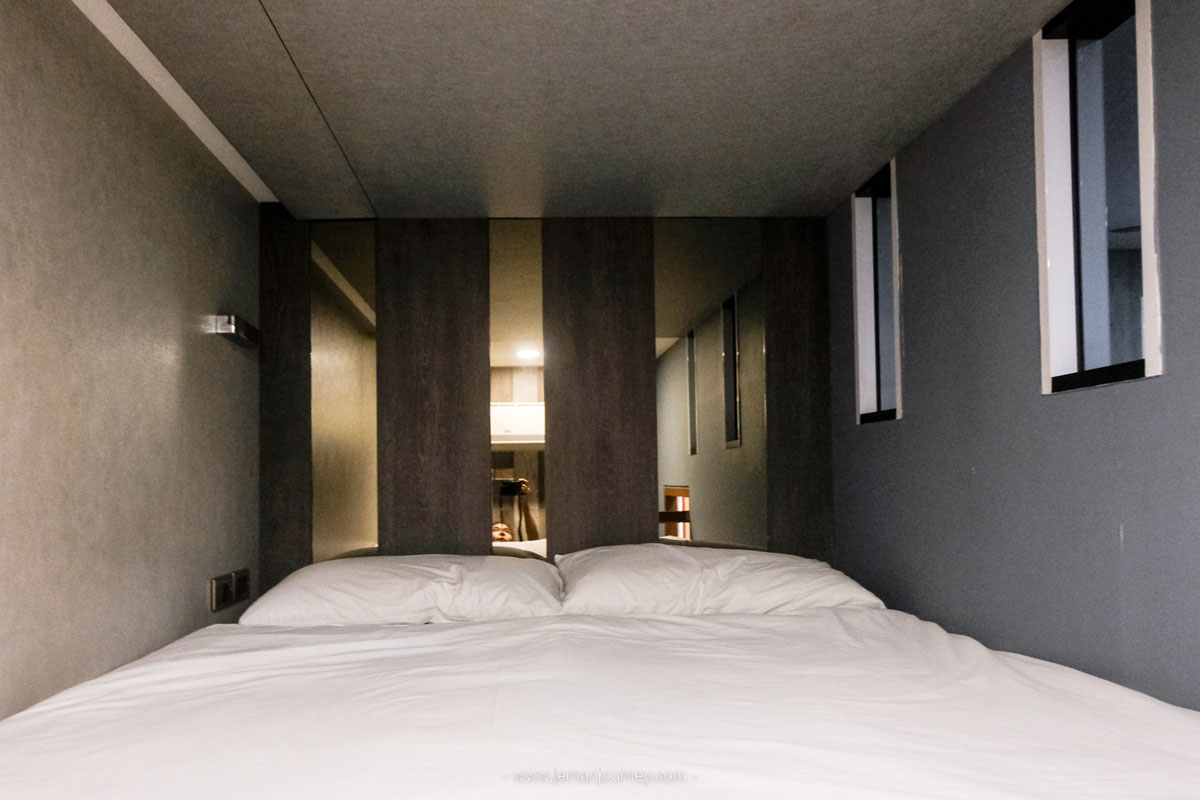 3. Private Double Bed Capsule ห้องเตียงใหญ่มีให้เลือกเป็นชั้นบนและชั้นล่าง เพียง 900.- ต่อคืน (สำหรับ 2 คน) ส่วนตัวเราว่าแบบเตียงล่างจะสะดวกกว่า