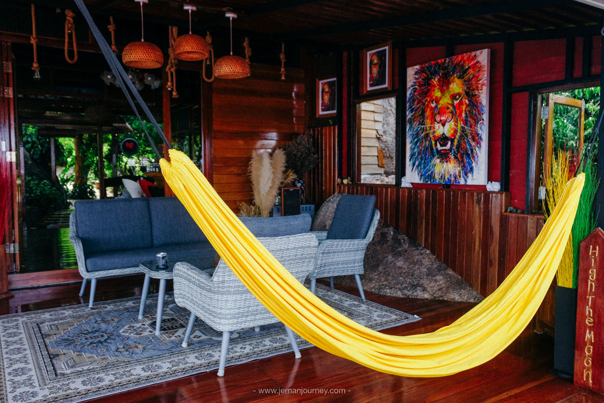 จุด Signature สำหรับถ่ายรูปของร้านนี้ คงจะหนีไม่พ้นพระจันทร์ดวงใหญ่ที่ประดับอยู่ตรงทางเดินไปจุดชมวิวนั่นเอง ส่วนใครที่ชอบนั่งเล่นนอนเปล ที่ร้านก็มีเปลให้นอนเยอะมาก รวมถึงมีบีนแบคให้ได้มาเอนหลังกันยาวๆ ไปด้วย