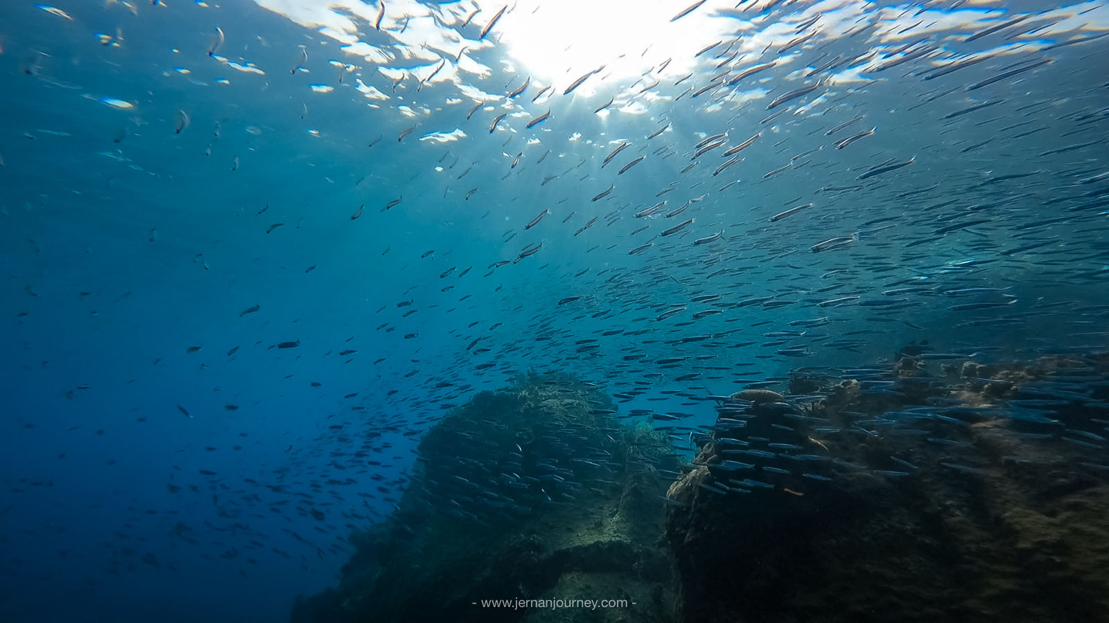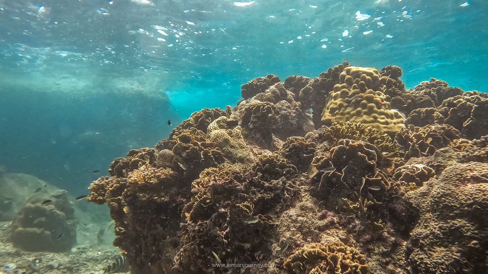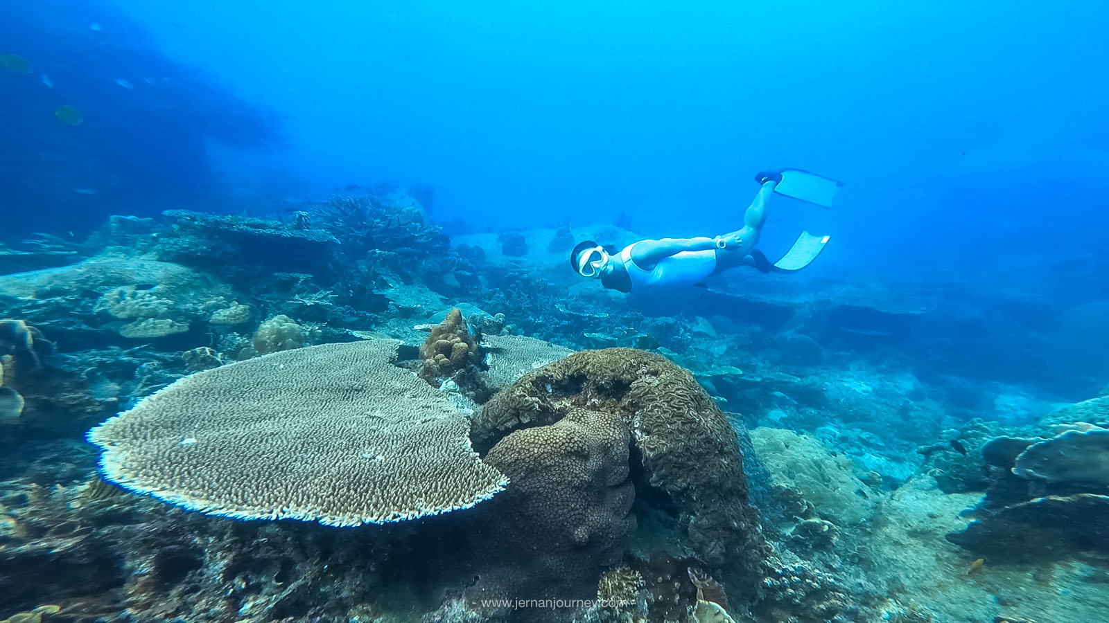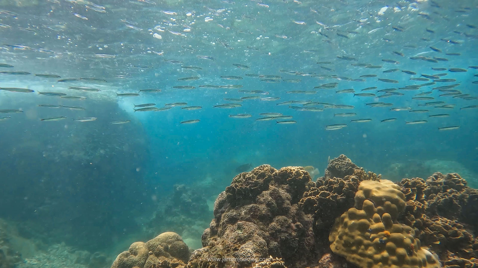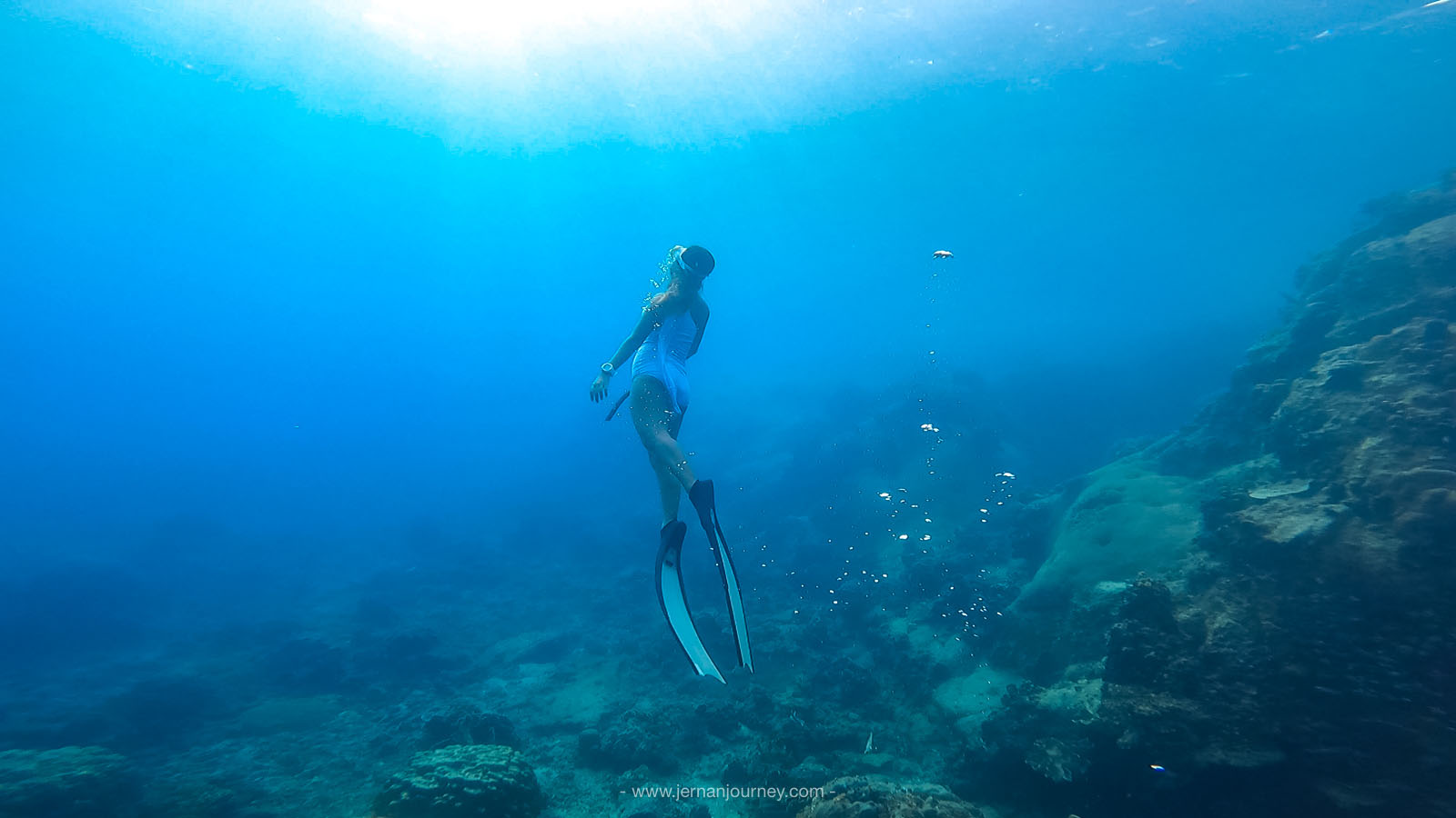 ถ้าวันไหนน้ำใส แดดจ้า คือเห็นถึงพื้นทั้งอ่าว มีปลาสายพันธุ์ต่างๆ และปะการังเยอะมาก สำหรับสายฟรีไดฟ์และสคูบ้าก็มีจุดให้ถ่ายรูปค่อนข้างเยอะ มีเรือคาตามารัน (18m) และมอเตอร์ไซค์ ใกล้ๆ กับหิน 4 ก้อน (ที่เราหาไม่เจอสักที 555) รวมถึงมี cube ปะการังเทียม (8-10m) ทางด้านขวาของอ่าว ถัดจาก Jumping Rock ไป ให้ไปฟรีไดฟ์ถ่ายรูป หรือฝึกลอดเพื่อปรับ Bouyancy กันสวยๆ ด้วย
