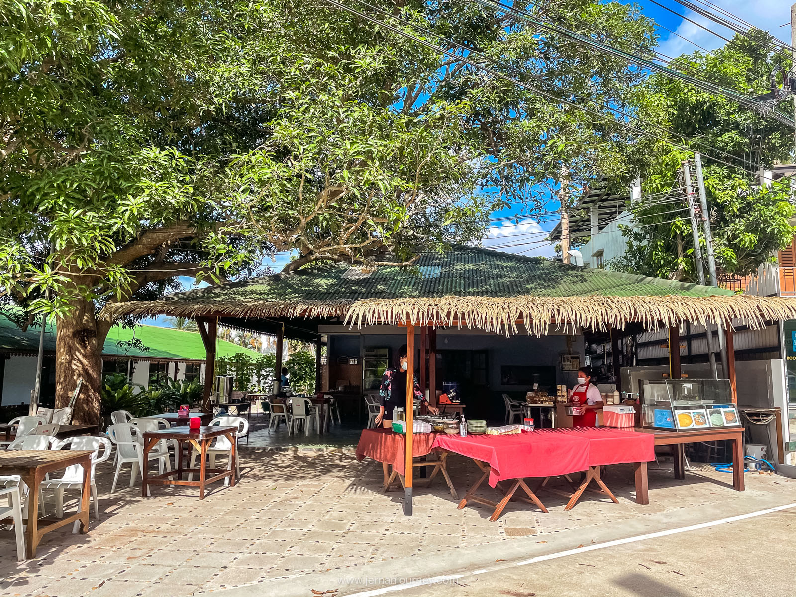 ส่วนอีกร้านจะอยู่ฝั่งถนน ฝั่งนี้จะมีขนมจีนรสเด็ด และหมูปิ้งไว้ให้ฝากท้องด้วย นอกจากจะให้บริการแขกที่พักแล้ว คนแถวนี้ก็แวะเวียนมาซื้อกันเป็นประจำ