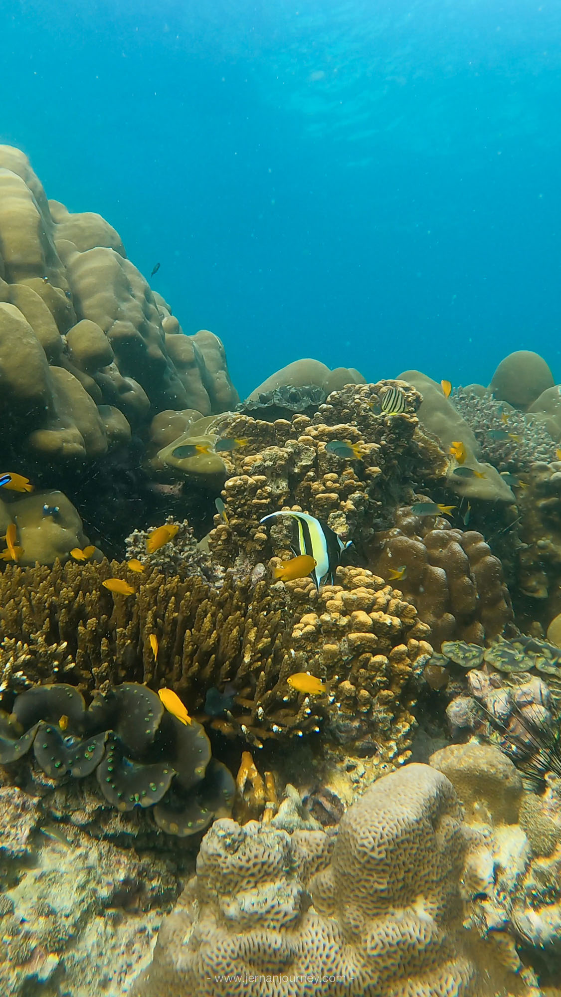 หากว่ายน้ำตีฟินออกไปจากด้านหน้ารีสอร์ท จะมีปะการังทอดเป็นแนวยาวหลากหลายชนิด ค่อนข้างอุดมสมบูรณ์ มีปลาและฝูงปลามากมายให้ตื่นตาตื่นใจ