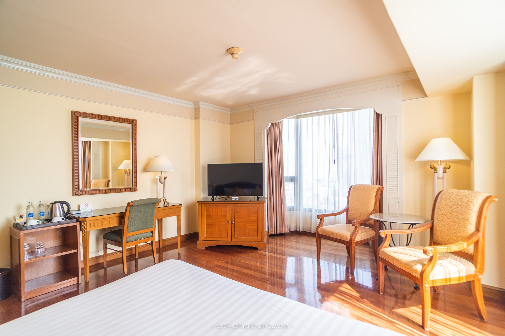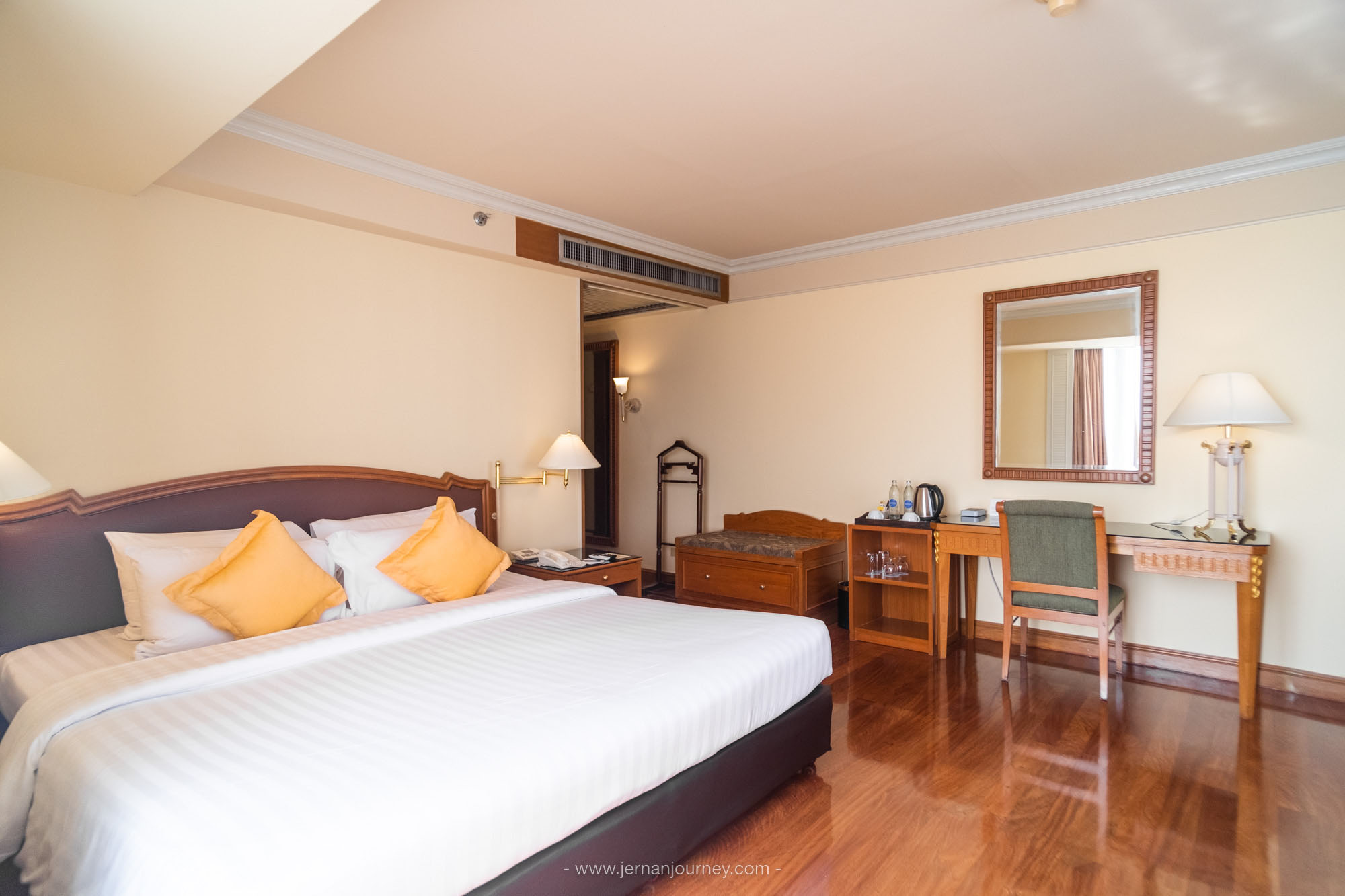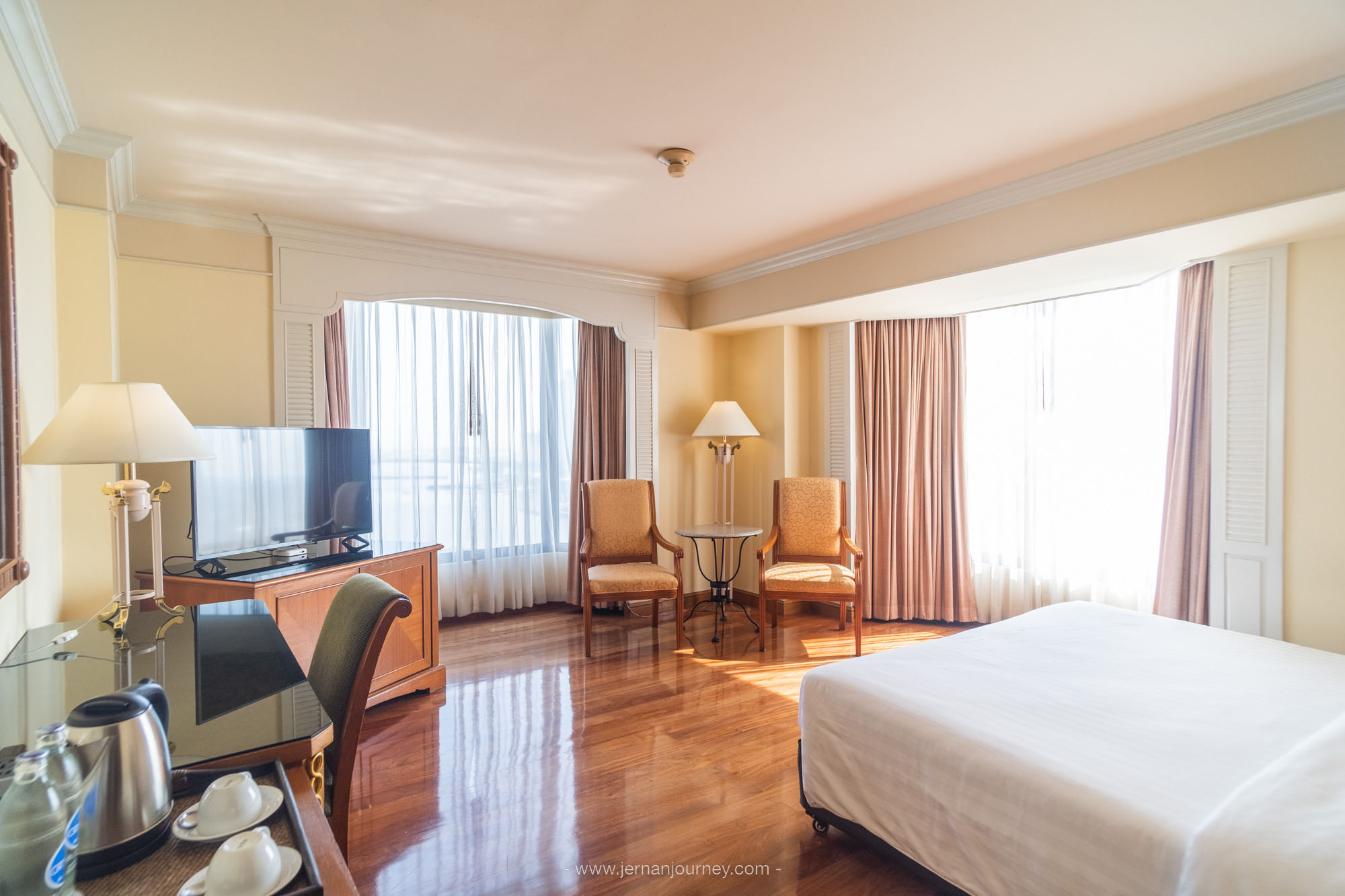 ที่นี่มีห้องพักหลากหลายไทป์ให้เลือกถึง 462 ห้อง ห้องที่เราพัก คือ Deluxe Corner มองเห็นวิวแม่น้ำจากเตียงนอนได้ถึง 2 มุม ผ่านกระจกบานสูงใหญ่ ห้องตกแต่งสไตล์ไทย–โมเดิร์นแบบเรียบหรู ห้องรีโนแวทใหม่ สวยมากทั้งแสงกลางวันและกลางคืน