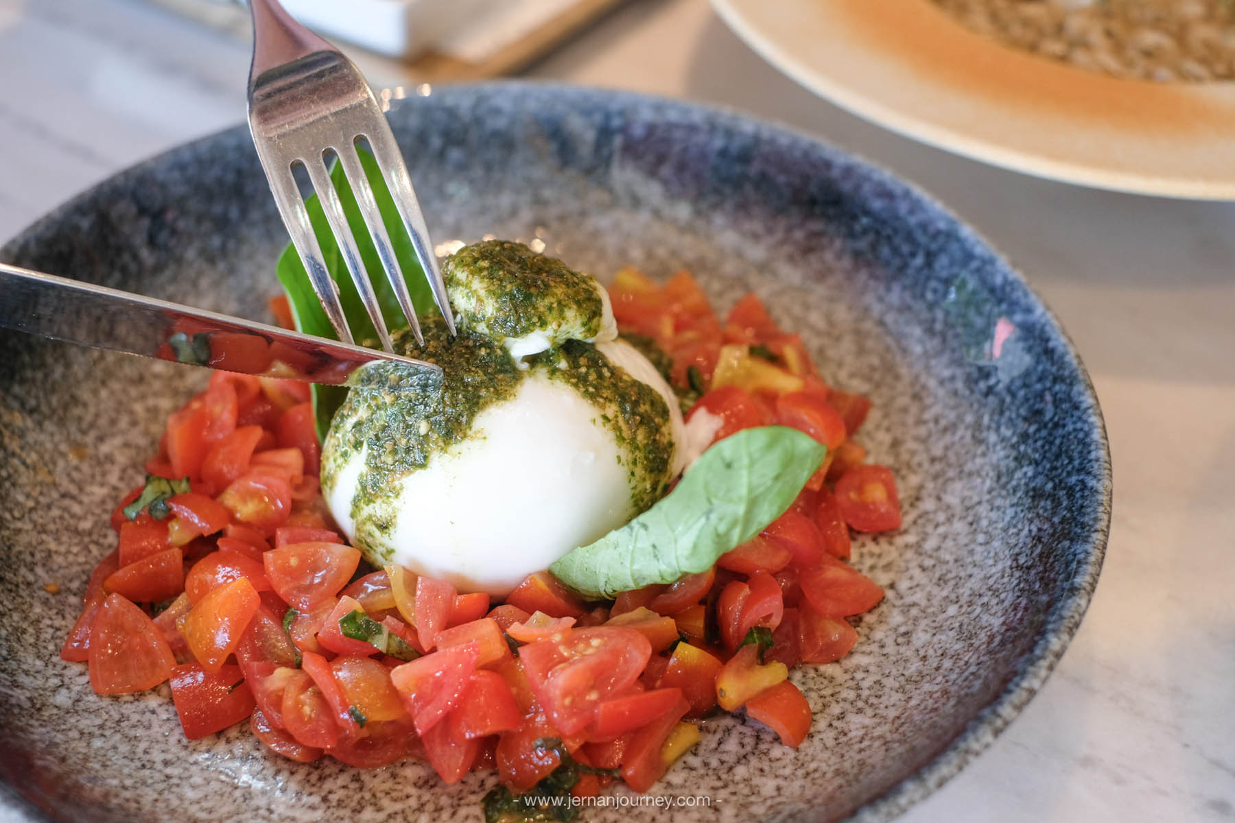 สำหรับวันนี้เมนูที่เราทานจะมี Burrata fresca (บูราต้าชีสและมะเขือเทศ), Prosciutto crudo e rucola (พิซซ่าปาร์มาแฮมและผักร็อคเก็ต),  Risotto taleggio e tartufo (ข้าวอิตาเลียนริซอตโตและเห็ดทรัฟเฟิล), Filetti di spigola (ปลากะพงย่างเสิร์ฟพร้อมกับฟักทองบด และซอสเคปเปอร์) และปิดท้ายด้วยของหวาน Chef’s tiramisu (ทีรามิสุ)