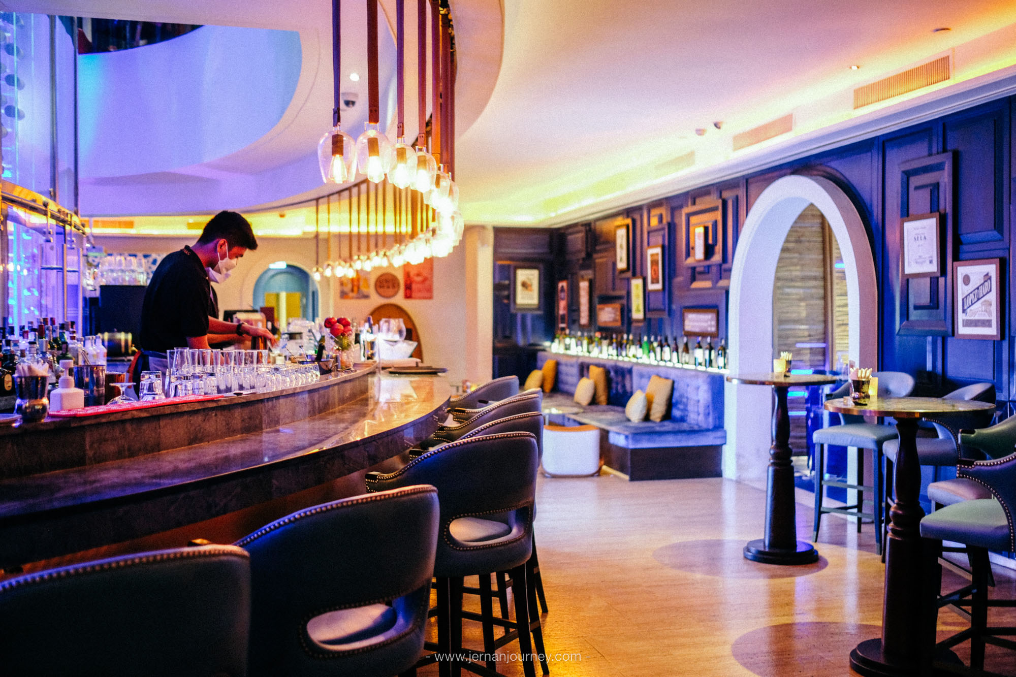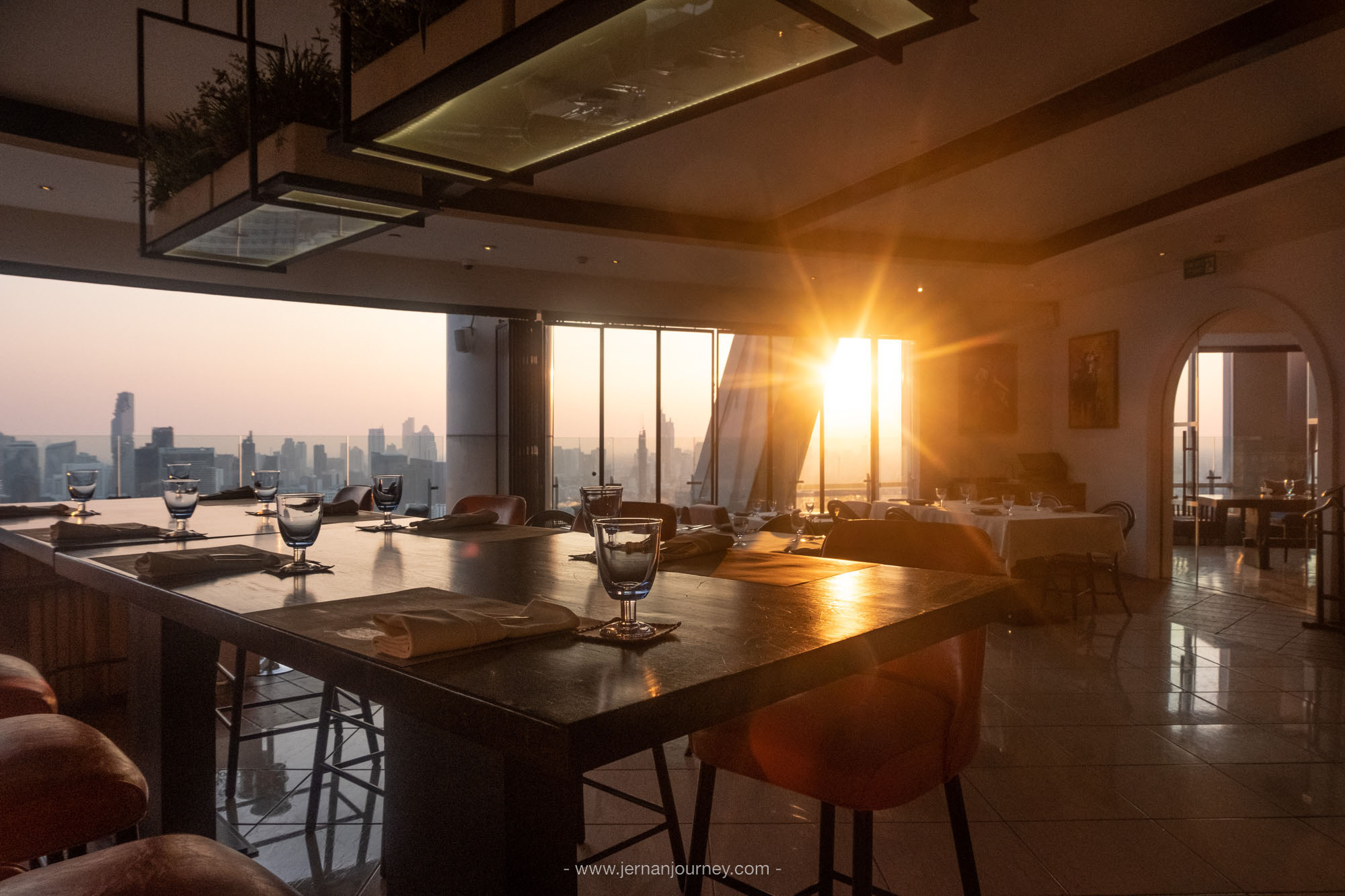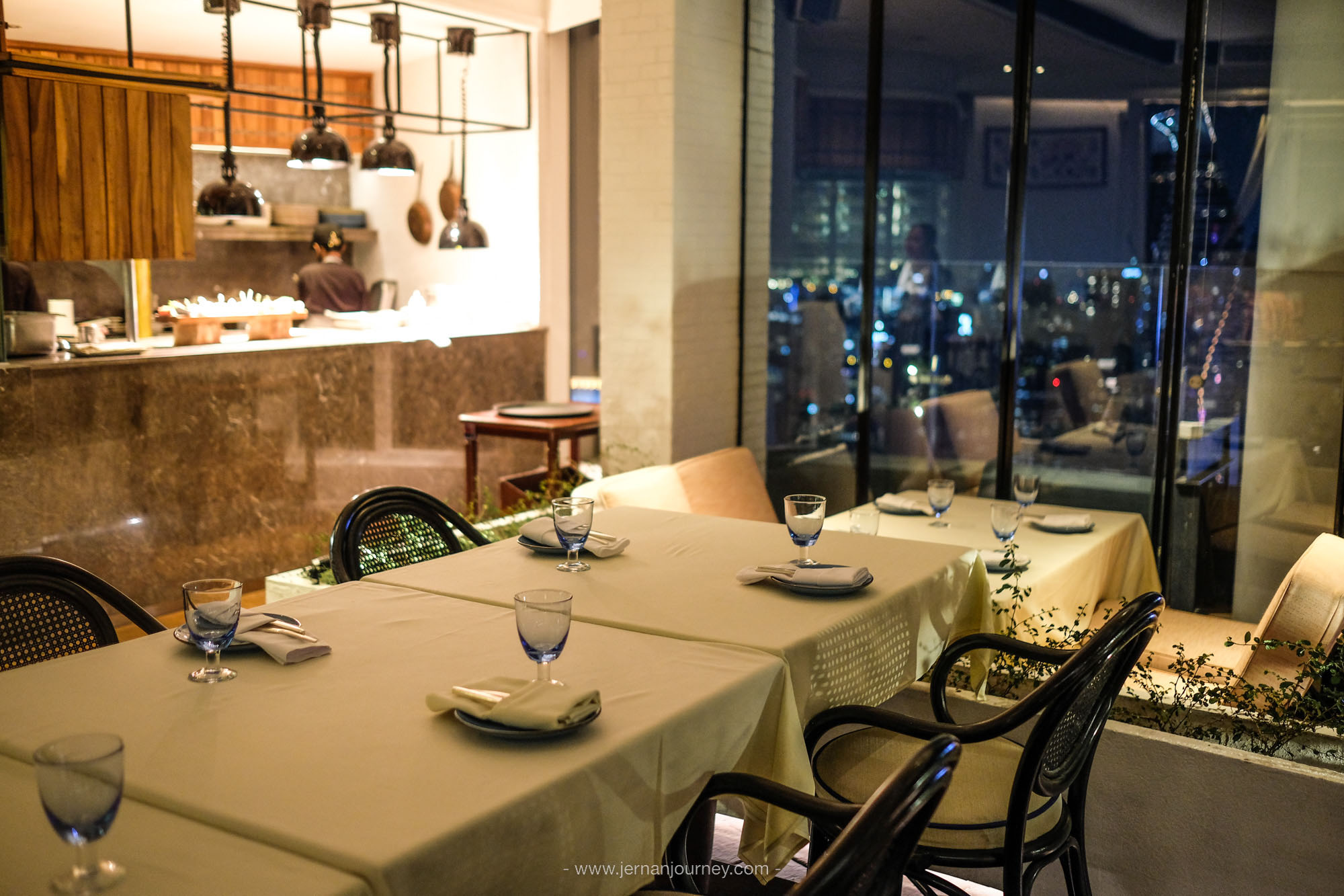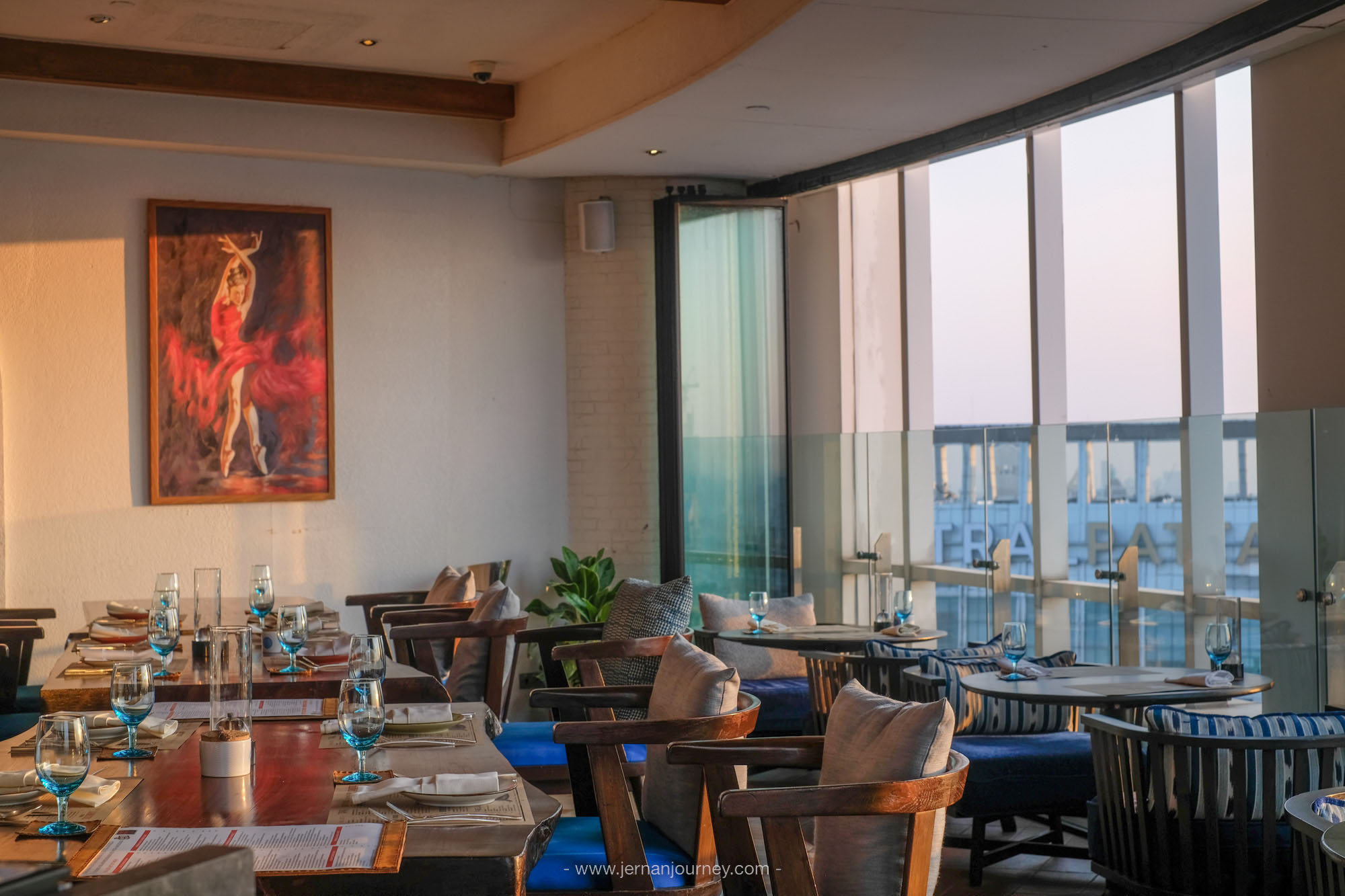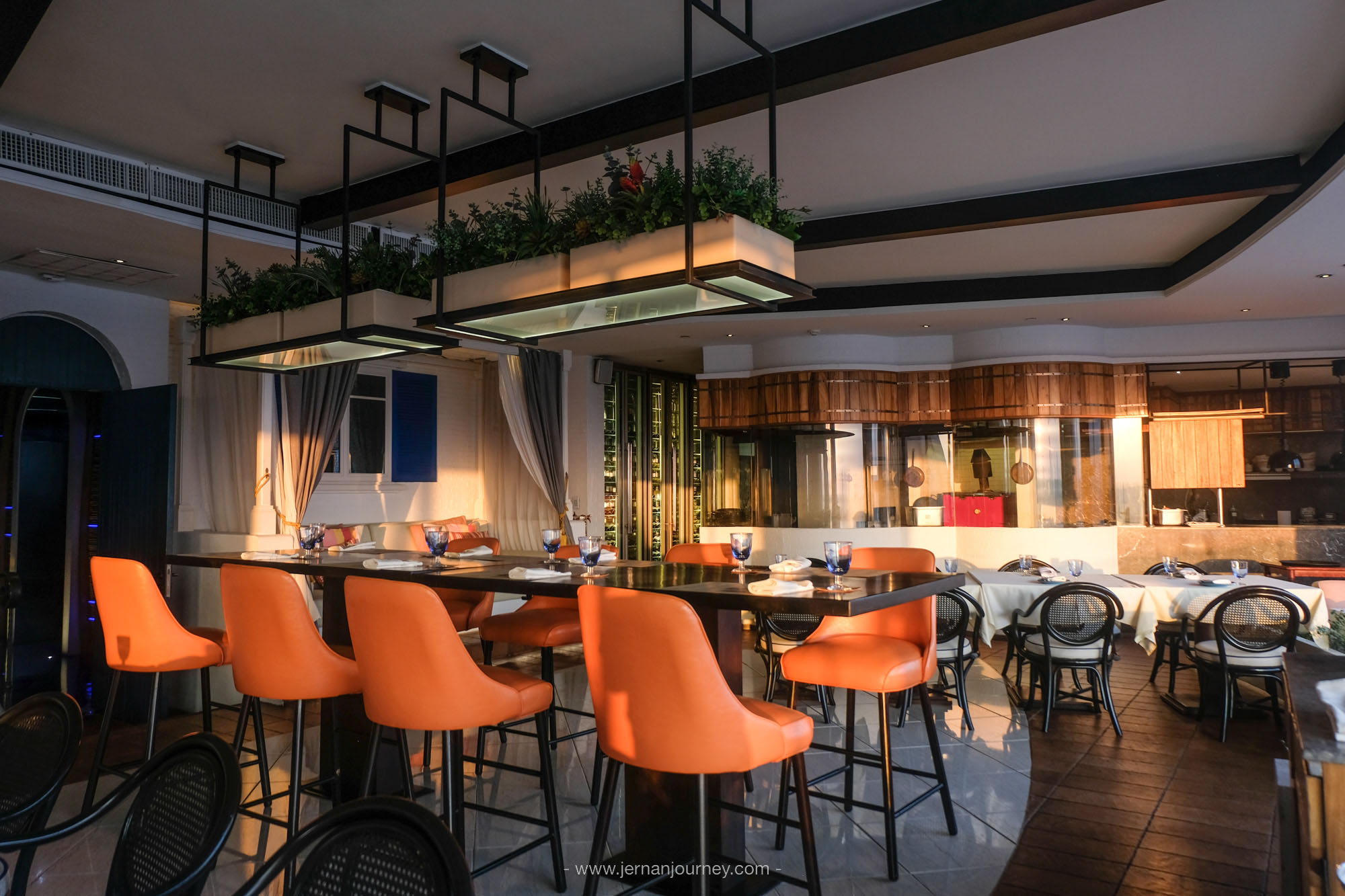 การตกแต่งที่ได้รับแรงบันดาลใจจากศิลปะสไตล์มัวร์ บนคาบสมุทรไอบีเรีย ที่ทำให้เรานึกถึงบรรยากาศของร้านอาหารแถบทะเลเมดิเตอร์เรเนียน ด้านหนึ่งของร้านเปิดเป็นกึ่งเอาท์ดอร์ ให้เราได้รับลมเย็นๆ และชมพระอาทิตย์ตกที่ขอบฟ้ากรุงเทพฯ ได้แบบไม่มีอะไรกั้น