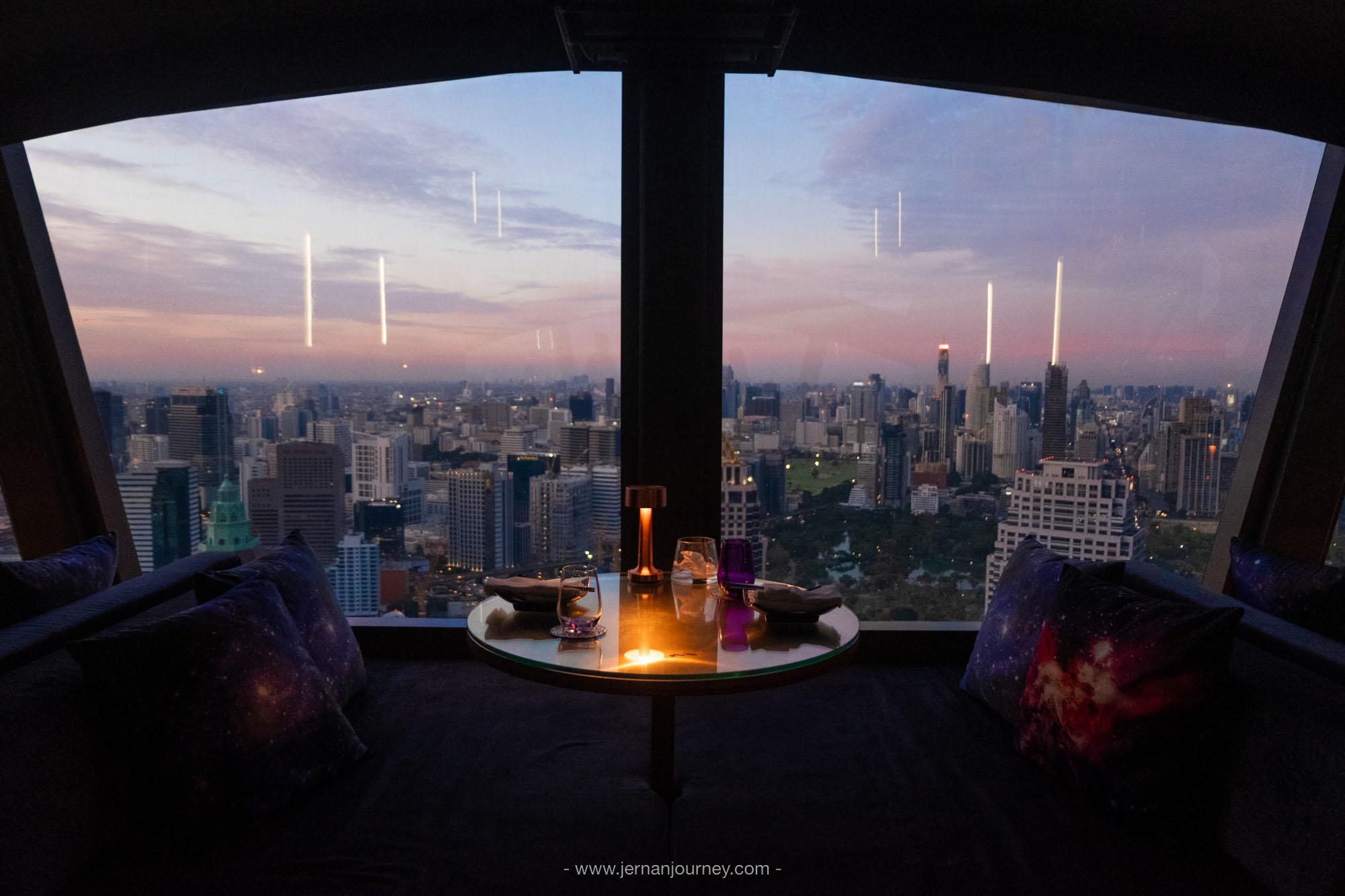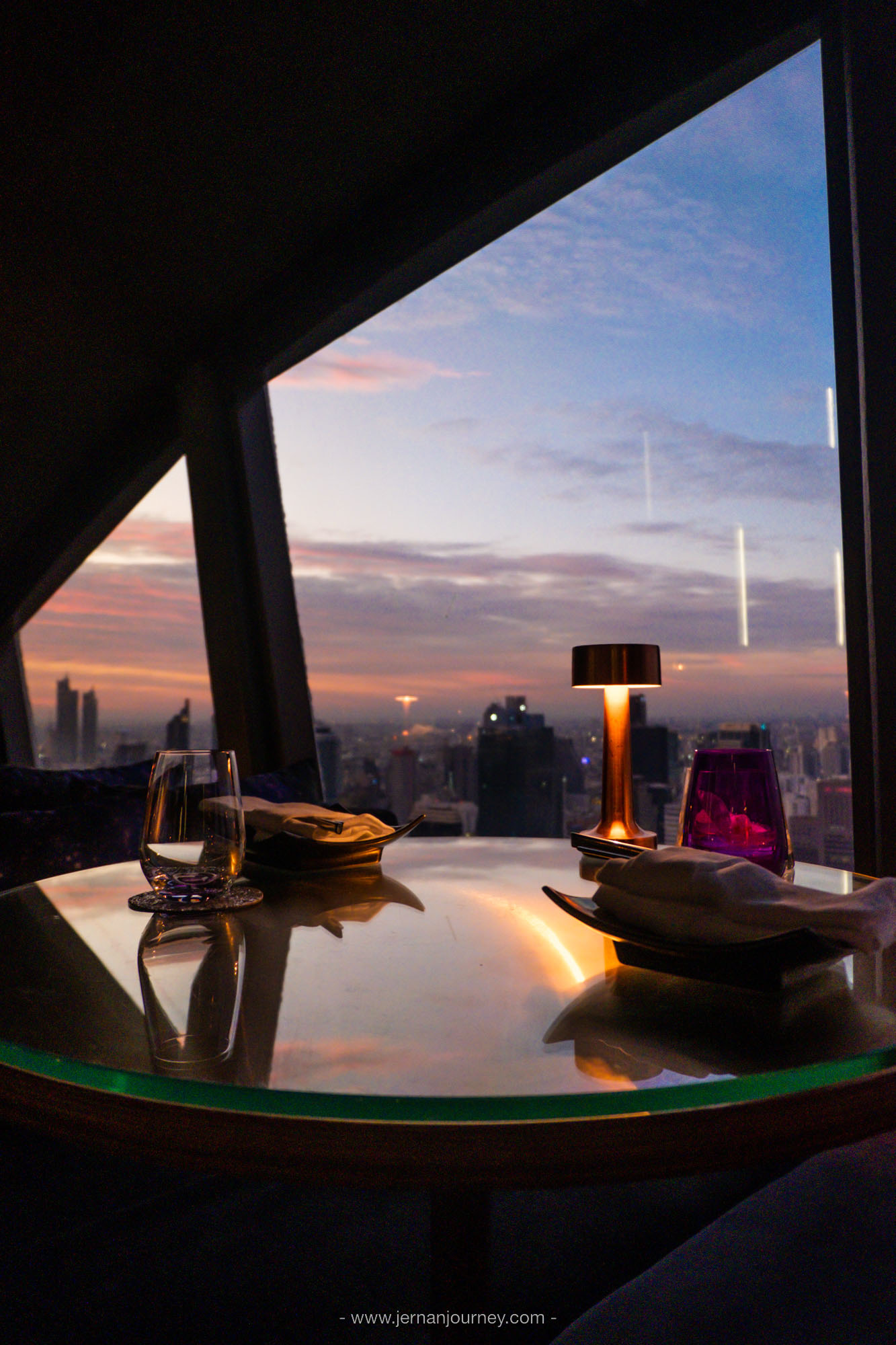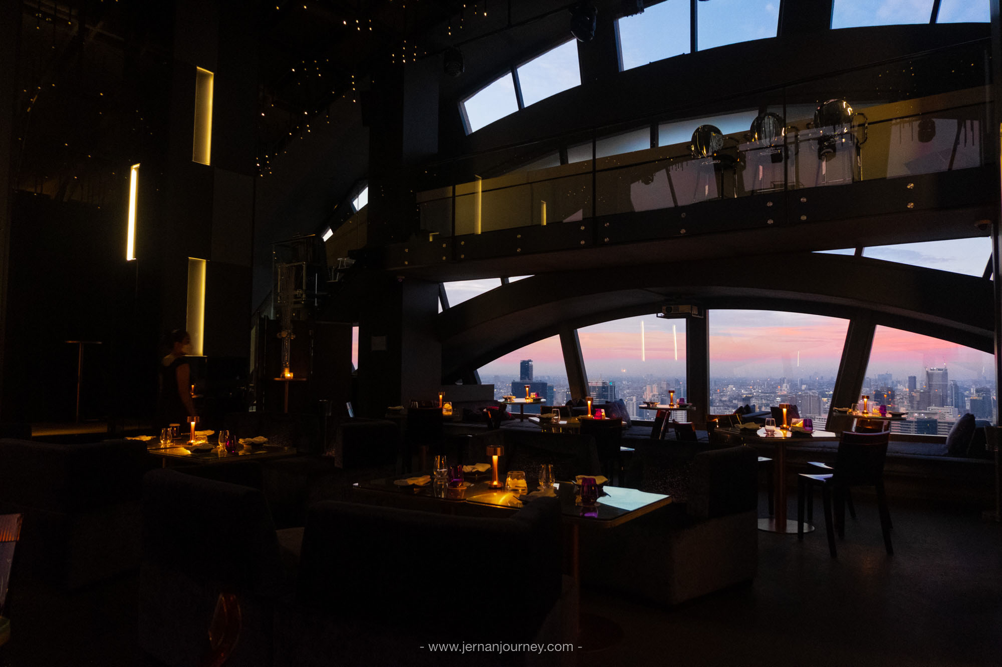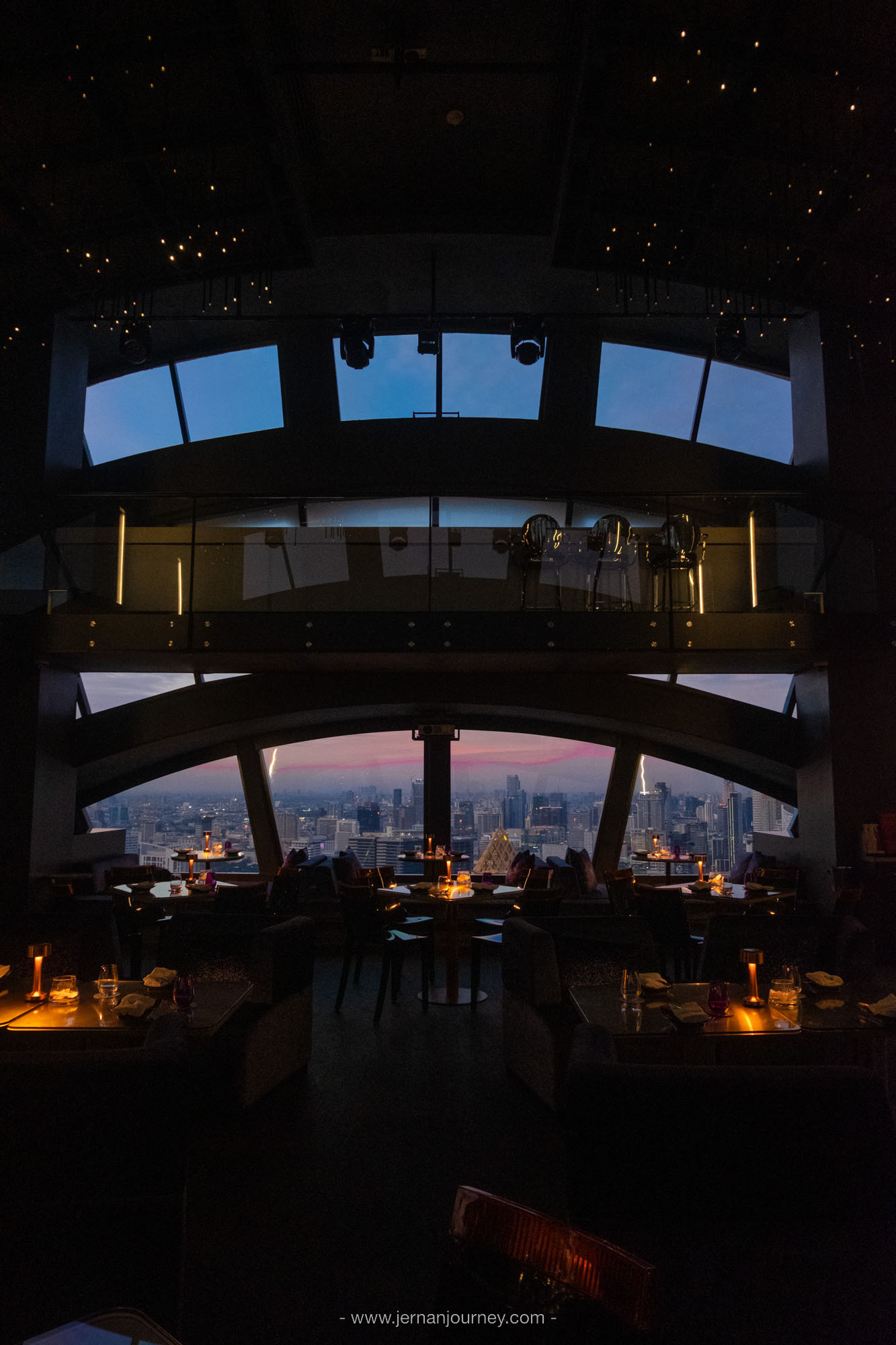 Vertigo TOO ห้องอาหารสไตล์เลาจน์สุดโรแมนติกบนชั้น 60 โรงแรม Banyan Tree Bangkok โดดเด่นด้วยดีไซน์กระจกโค้งครึ่งวงกลมที่ทำให้มองเห็นวิวเมือง วิวแม่น้ำและพระอาทิตย์ตกแบบเต็มตา