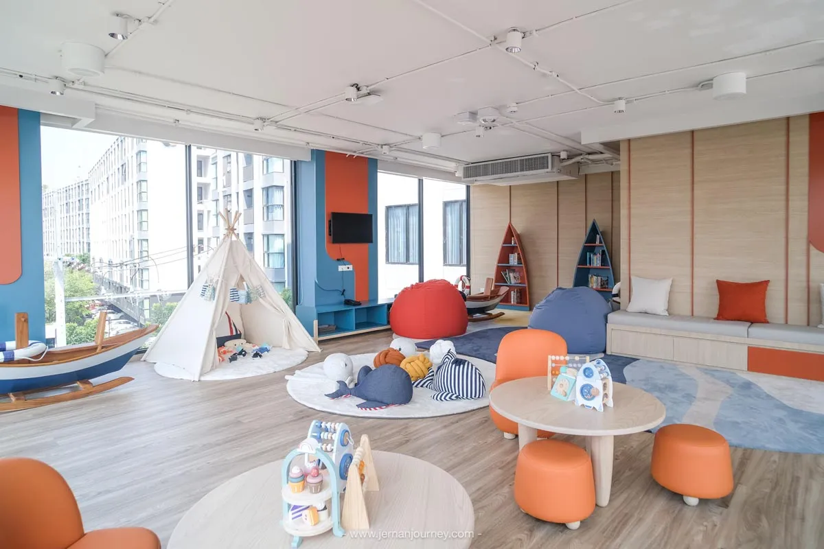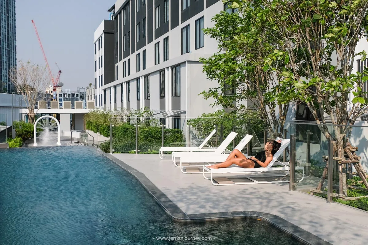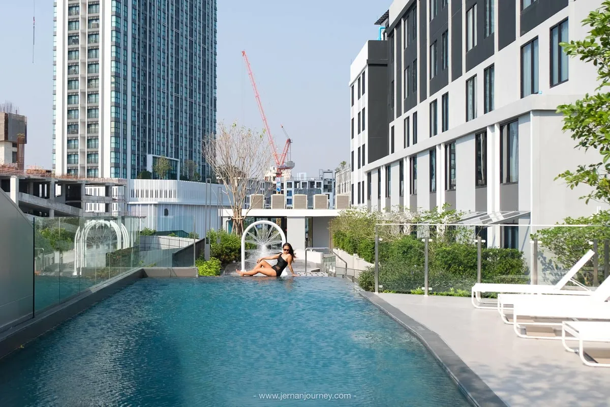 พื้นที่ส่วนกลางที่ชั้น 4 ก็มีทั้งสระว่ายน้ำ พร้อมเตียงอาบแดด ยิมขนาดย่อม  Kids Club และสระเด็ก