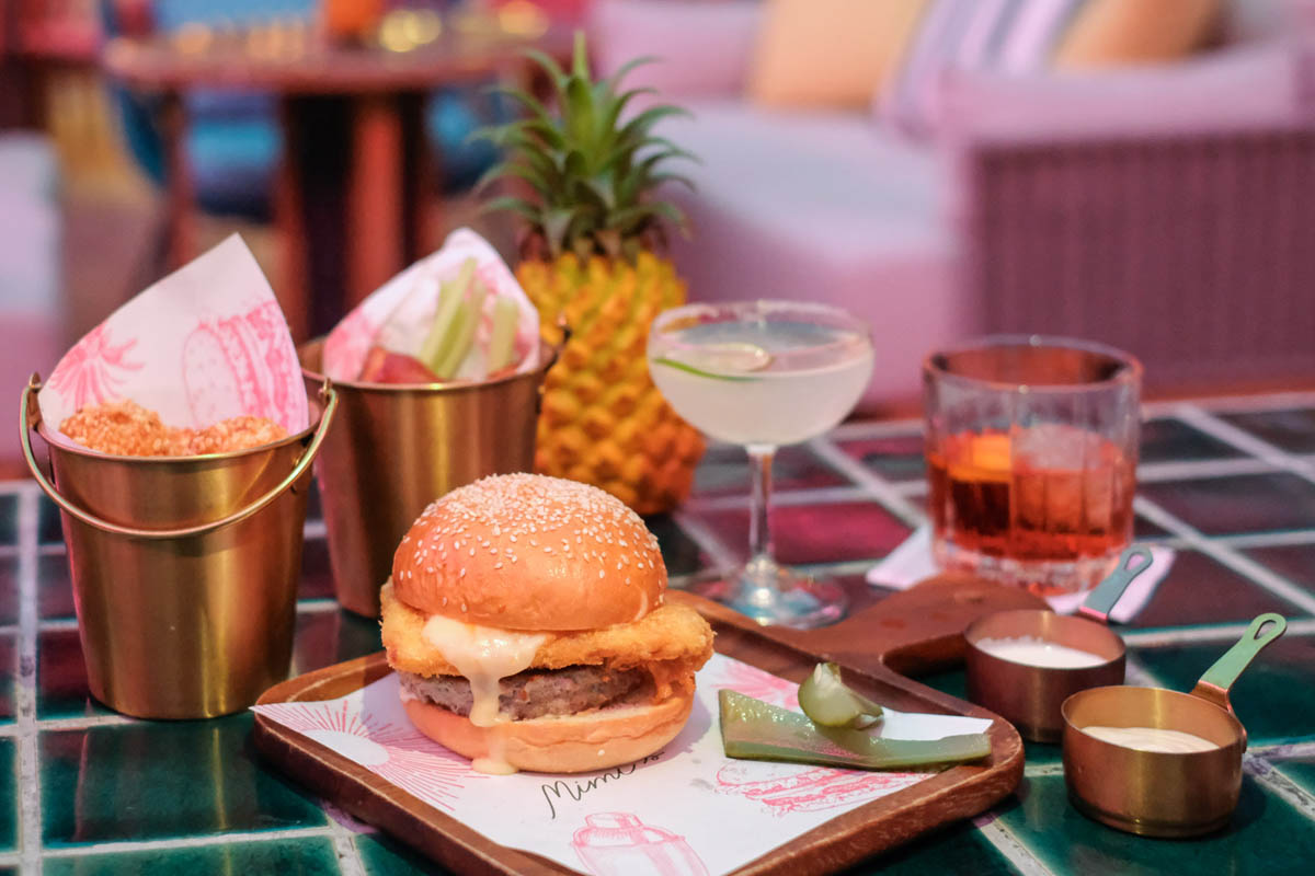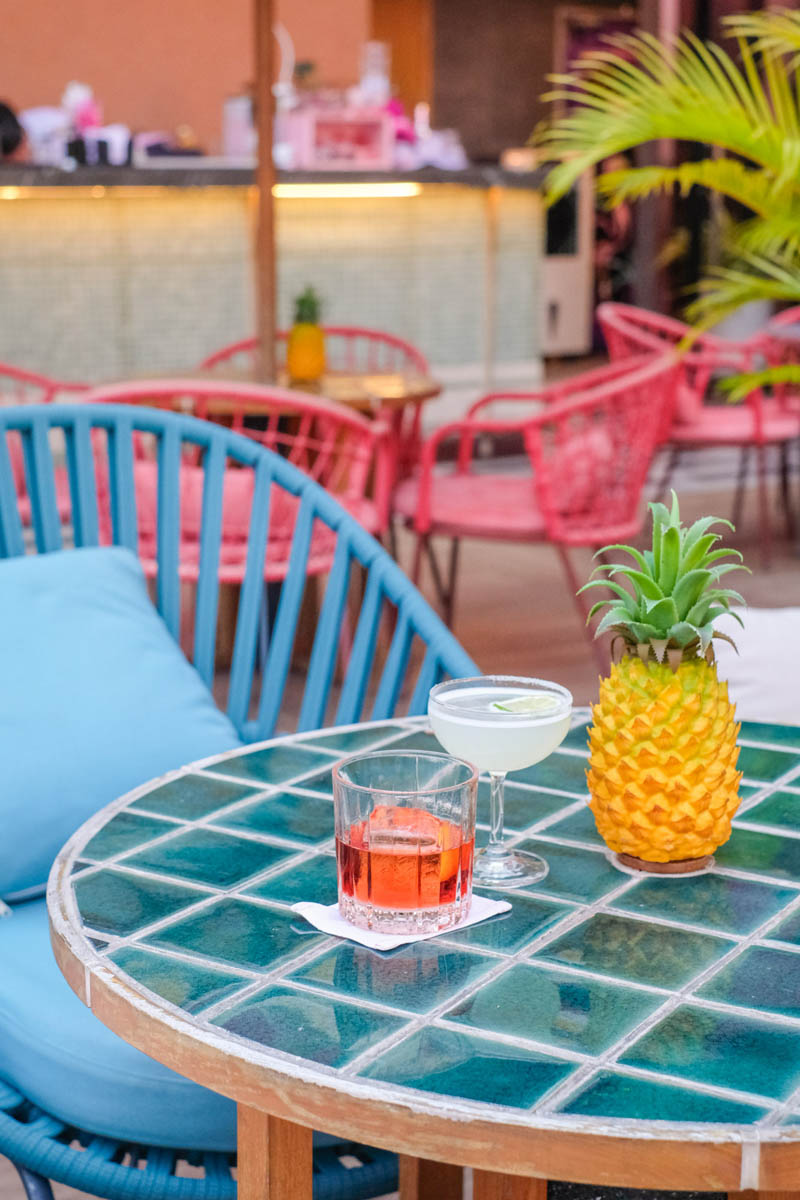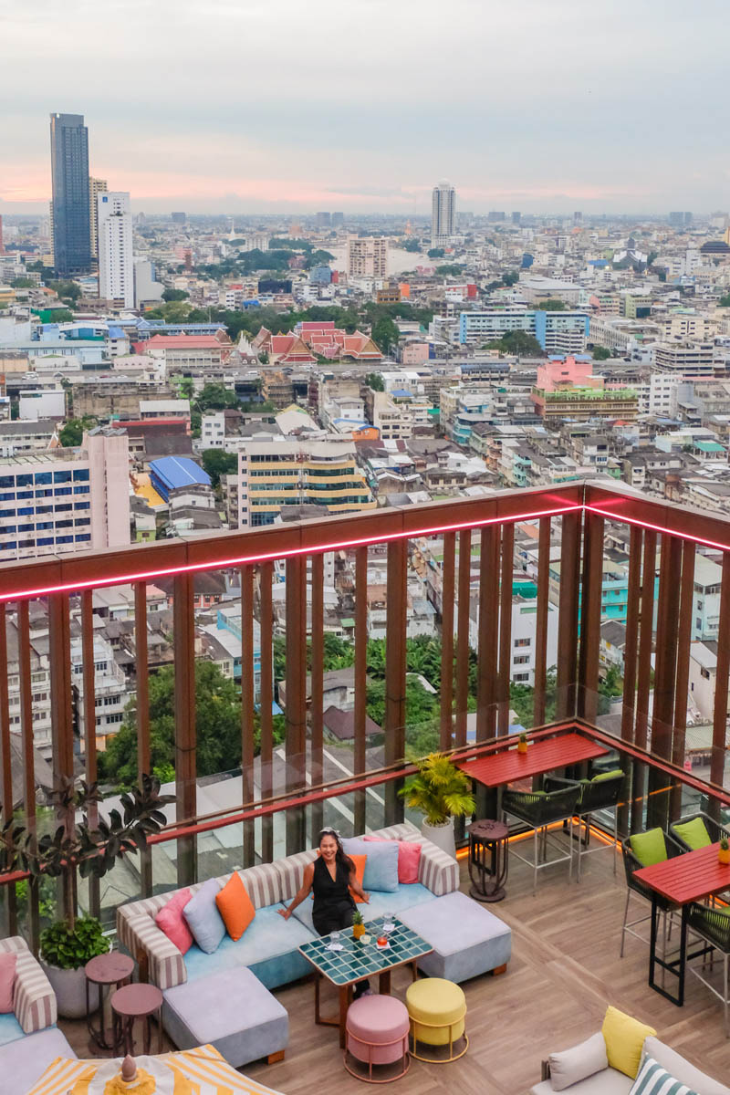 ด้านบนมี Mimi’s Bangkok 🍸 Rooftop Bar ที่เรียกว่าจัดจ้านสุดในย่านนี้ มี 2 ชั้น ชั้นแรกเป็นสีชมพู ส่วนชั้นบนเป็นโต๊ะบาร์พร้อมวิวกรุงเทพฯ แบบ 360 องศา วันที่เราไปฟ้าฝนไม่เป็นใจเท่าไหร่ แต่ก็ยังมู้ดดีอยู่นะ